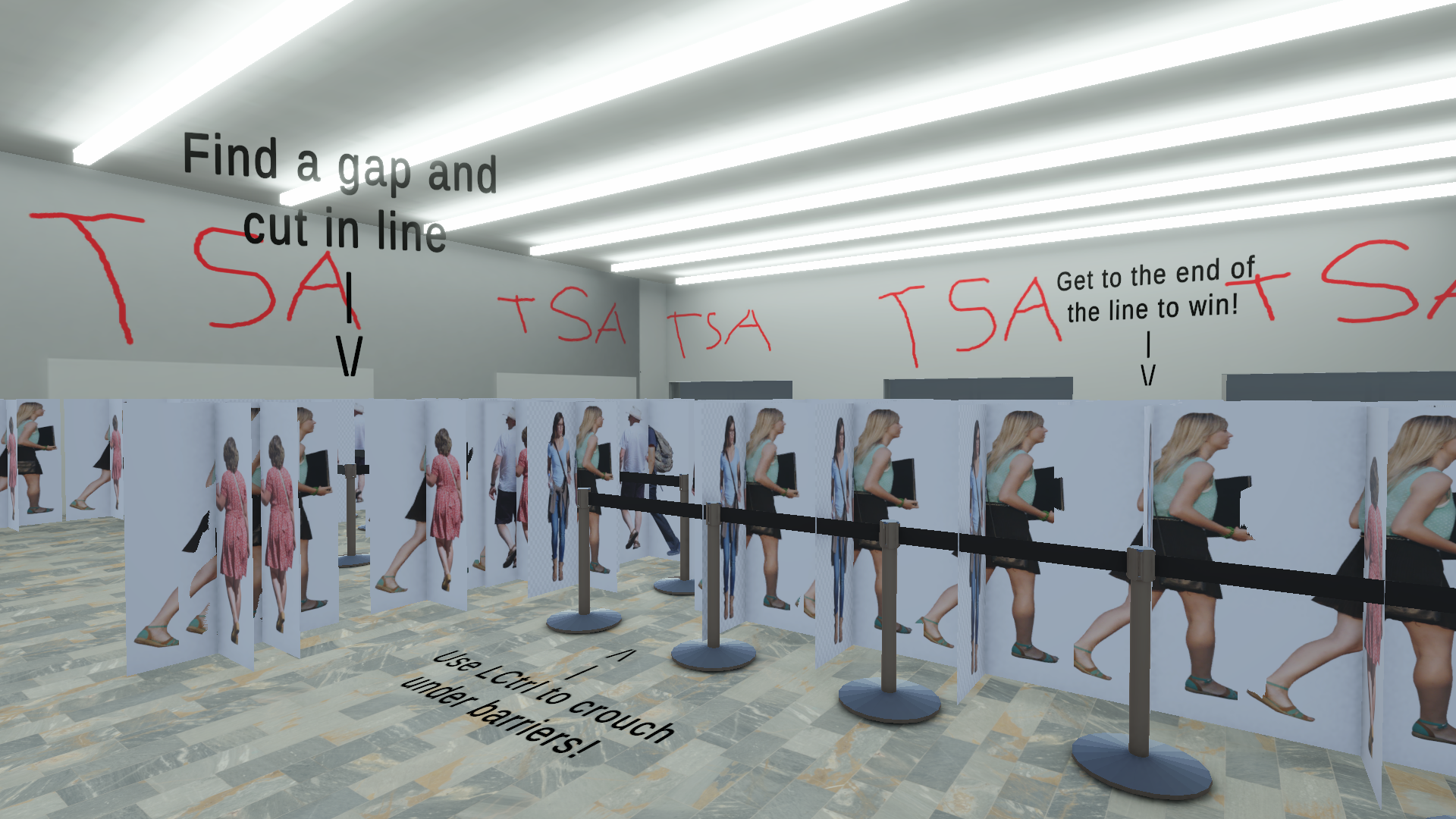 WASD to move around, Left CTRL to crouch, and mouse to look. Get to the end of the line as soon as you can!